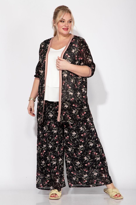 Комплект женский трехпредметный свободного силуэта. Состоит из кардигана, блузона и кюлот. Кардиган без застежки, рукав втачной 3/4 с притачным довязом. Длина кардигана 83 см. Блузон двухслойный без рукава на брителях. Кюлоты на резинке с карманами в боковых швах и на подкладке. Длина кюлот 100 см.
