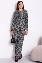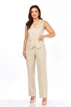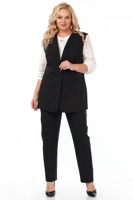 Костюм женский двухпредметный,состоит из жилета и брюк. Жилет на подкладке,с подрезом по талии и функциональными карманами , застежка на петли и пуговицы. Брюки классические с высокой посадкой,застежка на молнию и пуговицу,в боковых швах карманы. Длина жилета 70 см, длина брюк 103 см.