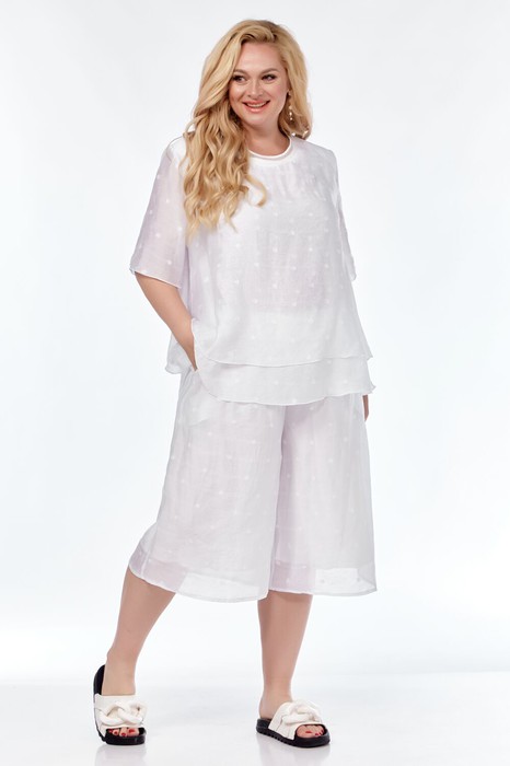Костюм женский двух предметный, свободного силуэта. Блузка двухслойная, рукав втачной. Шорты на подкладке, пояс на резинке, в боковых швах карманы.