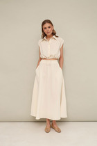 Костюм женский 2-ух предметный .Блузка с центральнобортовой застежкой на петли и пуговици, воротник рубашечный на стойке .Рукав длинный , втачной с манжетой. Юбка с ваданоми по низу ,пояс на резинке.