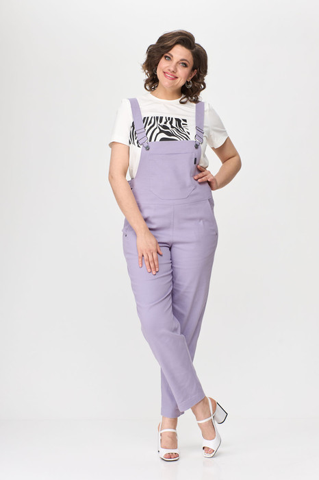 Комбинезон выполнен в спортивном стиле, отрезной по линии талии, с бретелями застегивающими на металлическую застежку. По переду на груди накладной карман. По брюкам в боковых швах лампасы, по переду в боковых швах брюк на уровне бедер карманы. На задних половинках накладные карманы.