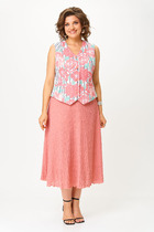 Комплект женский двухпредметный. Блуза свободного покроя. Вырез горловины асимметричной формы с воланом и декоративной патой в области плеча. Рукав один отрезной на базе цельнокроеного. В боковых швах разрезы. Брюки прямые, в боковых швах функциональные карманы. Пояс отрезной с эластичной тесьмой.