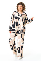 Комплект женский, состоит из платья и жакета. Жакет укроченный свободного кроя с застежкой на 1 петлю и пуговицу. Воротник пиджачного типа с лацканом. Рукав цельнокройный длиной 3/4. Платье полуприлегающего силуэта, чуть расклешенное к низу. Перед с косым подрезом и мягкими складками в области талии. Горловина в виде "качели". Пройма соспущенной линией плеча. Спинка со средним швом и потайной молнией до подреза. В области талии косой подрез.