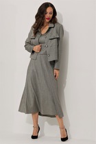 Комплект женский состоит из блузона и сарафана. Сарафан полуприлегающего силуэта, на бретелях, со средним швом по спинке, который заканчивается разрезом. По переду нагрудные вытачки, в боковых швах обработаны карманы. Блузон свободного кроя со спущенной линией плеча. Втачной одношовный рукав с регулируемой длиной с помощью хлястика. По переду накладные карманы. По спинке кокетка. Воротник стояче-отложной с отрезной стойкой.