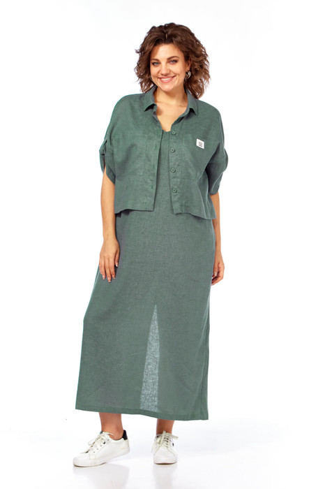 Комплект женский состоит из блузона и сарафана. Сарафан полуприлегающего силуэта, на бретелях, со средним швом по спинке, который заканчивается разрезом. По переду нагрудные вытачки, в боковых швах обработаны карманы. Блузон свободного кроя со спущенной линией плеча. Втачной одношовный рукав с регулируемой длиной с помощью хлястика. По переду накладные карманы. По спинке кокетка. Воротник стояче-отложной с отрезной стойкой.