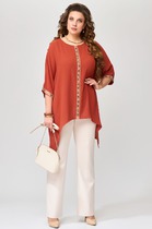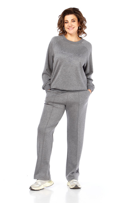 Комплект брючный состоит из кофты и брюк. Кофта свободного кроя с рукавом реглан. По низу рукава и низу изделия отделочный манжет-довяз, горловина круглая с отделочной бейкой (довяз). В качестве отделки используется вышивка. Брюки прямые, верхний срез обработан поясом с резинкой. В боковых швах обработаны карманы. На передних половинках застрочены складки.