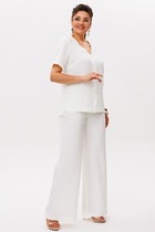 Комплект брючный состоит из кофты, жилетки и брюк. Кофта полуприлегающего силуэта со спущенным плечом, рукав втачной, одношовный. Воротник стойка с застежкой на тесьму-молнию. По боковым швам разрезы. Брюки расширенные книзу, верхний срез обработан поясом с резинкой. В боковых швах карманы. Жилетка свободного кроя со смещенной застежкой на петлю и пуговицу. По спинке горизонтальный рельефный шов на перед, в котором обработаны карманы. Цельнокроенный капюшон с центральной частью. В качестве отделки используется фурнитура.