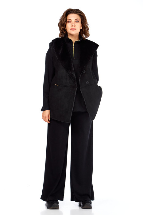 Комплект брючный состоит из кофты, жилетки и брюк. Кофта полуприлегающего силуэта со спущенным плечом, рукав втачной, одношовный. Воротник стойка с застежкой на тесьму-молнию. По боковым швам разрезы. Брюки расширенные книзу, верхний срез обработан поясом с резинкой. В боковых швах карманы. Жилетка свободного кроя со смещенной застежкой на петлю  и пуговицу. По спинке горизонтальный рельефный шов на перед, в котором обработаны карманы. Цельнокроенный капюшон с центральной частью. В качестве отделки используется фурнитура.