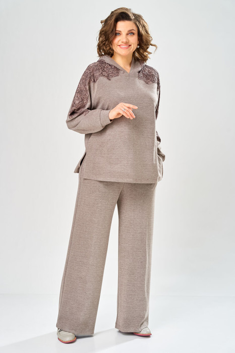 Комплект брючный состоит из кофты и брюк. Кофта свободного кроя покроя реглан. По низу рукава манжет. Капюшон с центральным швом. По боковым швам разрезы. В качестве отделки используется кружево по рукаву и капюшону. Брюки широкие, в боковых швах обработаны карманы. Верхний срез обработан поясом с резинкой.