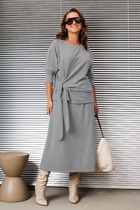 Жилет полуприлегающего силуэта с двубортной застежкой на прорезные петли и пуговицы; с отложными лацканами и разрезами по бокам. Перед - с талиевой вытачкой, переходящей в рельеф до низа, с подрезом по талии, с карманом, с настрочным клапаном над грудью. На клапанах пришиты пуговицы. Спинка - с талиевыми вытачками. Рукава короткие спущенные цельнокроеные. В комплекте - пояс с пряжкой из основного материала.