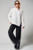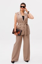 Костюм женский в спортивном стиле изтрикотажного полотна. Жилет свободный, с капюшоном. В кулису капюшона вставлен декоративный шнур. На переде жилета обработан накладной карман кенгуру с обтачными листочками. Низ жилетаобработан притачной планкой. В боковых швах планки с застежкой на кнопки. Брюки прямые с манжетами пояс с эластичной тесьмой с отделочными строчками. В боковых швах карманы.