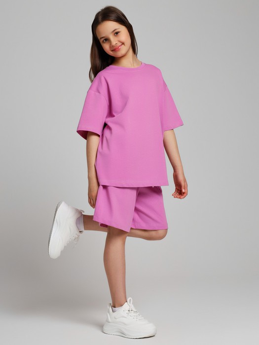 Костюм для девочки из плотного гладкокрашеного трикотажного полотна "кулирка", состоящий из футболки и шорт. Футболка - свободного покроя, с удлиненными плечевым и швами, короткими втачными рукавами и горловиной овальной формы, обработанной втачной планкой. В нижней части переда слева настрочен декоративный элемент прямоугольной формы. По горловине проложена отделочная строчка. Шорты - классического покроя, на притачном поясе с эластичной тесьмой внутри и карманами в боковых швах. Для регулирования степени прилегания шорт по талии в пояс вставлен шнурок, продетый через два отверстия в соединительных швах в центре пояса.