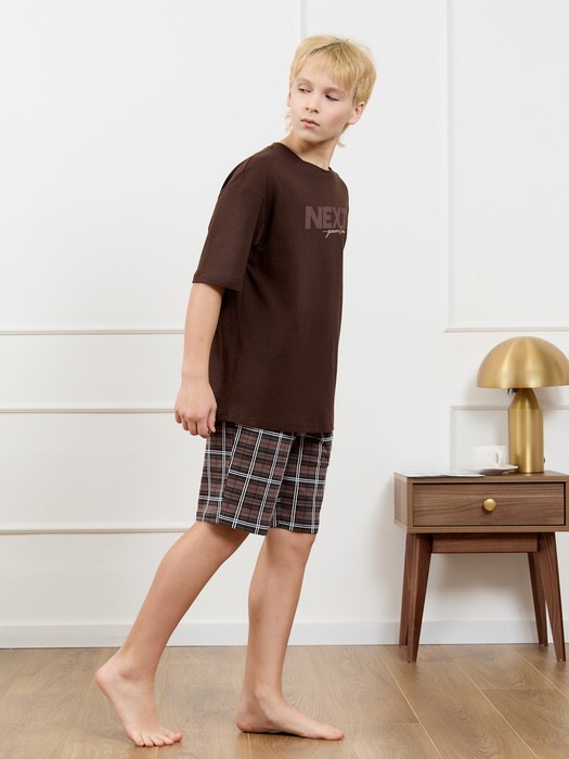 Костюм для мальчика из трикотажного полотна "кулирка", состоящий из футболки и шорт. Футболка классического покроя, с короткими втачными рукавами и приспущенной линией плеч, горловиной овальной формы, обработанной втачной планкой и принтом на детали переда, выполненным в технике шелкографии. Нижние срезы рукавов и изделия обработаны подгибкой. По горловине настрочена отделочная строчка. Шорты длиной до колен, на притачном поясе с эластичной тесьмой внутри, с карманами в боковых швах. Нижние срезы обработаны подгибкой.