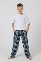 Костюмдля мальчика, состоящий из футболки и брюк. Футболка однотонная с принтом на груди; модель свободная, со спущенной линией плеч, овальным вырезом горловины. Брюки из полотна с набивным рисунком эксклюзивного дизайна, прямые, с боковыми карманами с обтачными входами, на притачном поясе с отстроченной эластичной тесьмой.