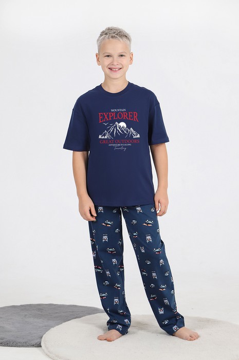 Костюм для мальчика ,состоящий из футболки и брюк. Футболка - из гладкокрашеного полотна "кулирка", классического покроя, с короткими втачными рукавами, горловиной овальной формы, обработанной втачной планкой, и принтом вцентре переда, выполненным в технике шелкографии. Брюки - из полотна с набивным рисунком, прямого силуэта, на притачном поясе с эластичнойтесьмой внутри и карманами в боковых швах, входы в которые окантованы основным материалом.