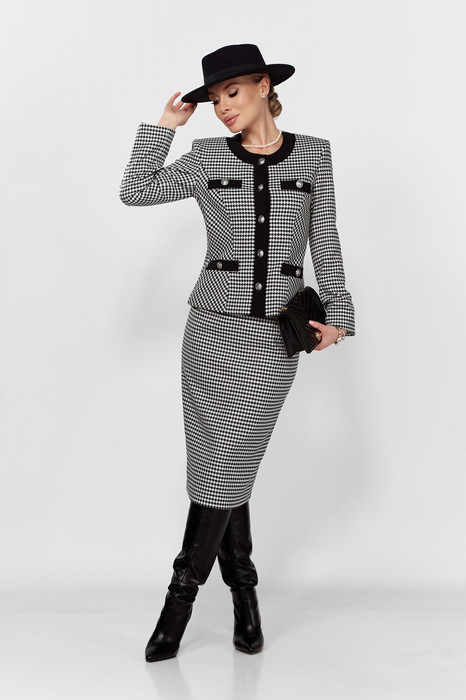 Элегантный стильный и одновременно очень универсальный и комфортный юбочный  костюм в стиле CHANEL, который несомненно будет приковывать взгляды окружающих к Вашему образу. Костюм женский полуприлегающего силуэта, жакет на подкладке с округлым вырезом горловины и с притачной планкой из контрастной ткани по полочкам и горловине, с застежкой на петли-пуговицы. На полочках жакета имеются рельефы и декоративные листачки с пуговицами. На спине обработаныф талиевые вытачки. Рукав длинный, втачной, двухшовный. Юбка на подкладке, с притачным поясом, с застежкой на потайную тесьму-молнию и пуговицу, с разрезом в среднем шве заднего полотнища. В поясе юбки по бокам вставлена резинка для регулировки обьема талии.