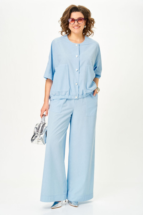 Летний брючный костюм из легкого вельвета , безупречный фасон в сочетание с нежным цветом сделает ваш образ идеально модным как в ежедневной носке так и  для особого случая . Жакет свободного прямого , кроя с накладными карманами , на застежке петли пуговицы, по низу эластичная лента , рукав  укороченный , резной с отстрочками . Брюки прямого силуэта, с накладными карманами, средней посадки , без застежки  на поясе с резинкой.Возможна замена фурнитуры.