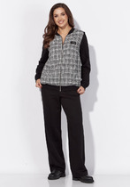 Настоящее произведение искусства!!! Уверенность, элегантность, этого костюма делает его идеальным выбором для важных деловых встреч, корпоративных мероприятий и незабываемых вечерних выходов. Изысканный комплект тройка выполнен из качественной стрейчевой ткани. Топ облегающего силуэта с рельефами по полочке, по спинке выточки и потайная молния в среднем шве. Брюки клёш от колена с за утюженым кантом, которые подчеркнут вашу утонченность и изысканность. Застежка молния по переду, по бокам прорезные карманы, пояс со шлевками и эластичной лентой по бокам. Жакет "BLAZER" без застежки на подкладке, рукав втачной расширенный к низу с декоративной шлицей. Изящность комплекту придает контрастная отделка воротника, планок, разреза шлицы и съемного декоративного цветка ручной работы подчеркнет вашу неотразимость и безупречный вкус.
