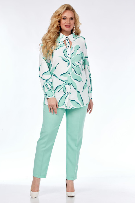 Комплектация из блузы и брюк. Блуза прямого силуэта, выполнена из нежной, приятной ткани, стойкой к сминанию. Воротник классический, рубашечный на отрезной стойке, эстетично подчеркнут вырез горловины, что придает изделию дополнительный образ. Рукав втачной, низ обработан притачной манжетой. По спинке заложена и застрочена бантовая складка. Низ изделия асимметричный. Брюки слегка зауженные к низу. Пояс притачной, частично на резинке. Застежка спереди брюки на тесьму-молнию, петлю-пуговицу.
