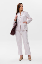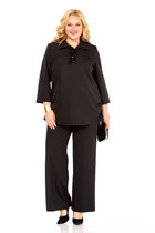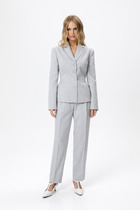 Комплект женский брючный 2-х предметный.Стильный классический жакет, прекрасный вариант на каждый день. Модель прямого силуэта с центральной бортовой застежкой на петли-пуговицы и с фигурным клапаном. Низ изделия обработан отрезной деталью, где полоска оформлена по диагонали. Спинка со средним швом. Рукав втачной, полной длины. Жакет частично на подкладке (полочки и спинка).Брюки классические, слегка зауженные к низу, на притачном поясе, застежка на тесьму-молнию и одну петлю, пуговицу
