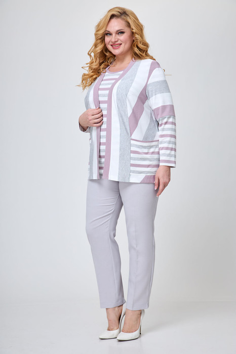 Комплект женский 3-х предметный. Жакет свободного силуэта, из трикотажного полотна, без пуговиц, со спущенной линией плеча, с втачным рукавом, с карманами. Блузка-топ из трикотажного полотна, с втачным рукавом, с разрезами в боковых швах, вырез горловины круглый. Брюки на резинке, прямые, слегка зауженные к низу, с заутюженными стрелками