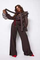 Комплект женский состоящий из блузы и брюк. Блуза :прямого силуэта с длинным втачным рукавом, со сборкой по окату и воланом на резинке по низу. Перед с центральной застежкой, навесными петлями и пуговицами. Вырез горловины Y-образный с воротником стойкой, переходящий в завязывающийся бант. Перед и спинка с фигурными кокетками, в швы кокеток вставлены двойные воланы разной ширины. Брюки прямого силуэты с притачным поясом на застежке молнии. По спинке по поясу резинка и талиевые вытачки. Перед с застежкой-гульфик и пуговицей, с накладными карманами с боковым входом. В комплект входит декоративный ремень.