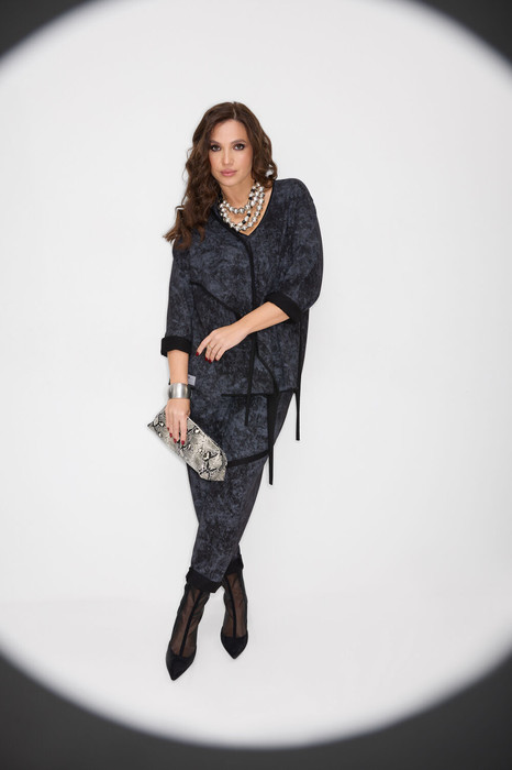 Комплект женский, состоящий из блузона и брюк. Блузон прямого силуэта со спущенной линией плеча. Рукав одношовный, длинный, заканчивающийся открытым срезом. Вырез горловины V-образный, с притачной планкой и декоративным элементом из основной ткани. Перед с асимметричными подрезами и декоративными элементами. Низ блузона выполнен открытым срезом. Брюки свободного силуэта, заужены к низу. Пояс притачной, с резинкой. Перед брюк с боковыми карманами. Брюки с фигурными подрезами. Подрезы и низ брюк выполненными швами с открытыми срезами.