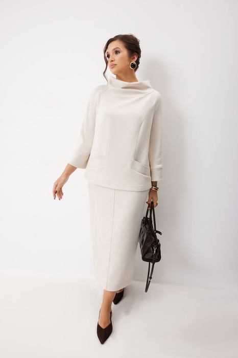Комплект женский, состоящий из туники и юбки. Туника прямого силуэта, по переду рельефы и карманы с листочкой. Рукав покроя реглан, заканчивающийся притачной манжетой Воротник по спинке - цельнокроеная стойка, по переду мягкой формы. Юбка прямого силуэта, на подкладке. Переднее полотнище со средним швом, заднее полотнище со средним швом с разрезом и потайной молнией в нем, верхний край юбки на обтачке.