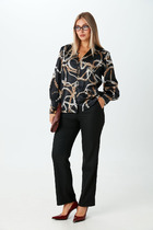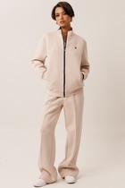 Костюм женский выполнен из льна-вишера. Костюм состоит из брюк и блузона. Брюки зауженные к низу на притачном поясе с резинкой. В боковых швах имеются функциональные карманы. Блузон из ткани в полоску с асимметричной молнией по переду. Горловина - асимметричная. Рукав – приспущенный с манжетам по низу. Спинка с кокеткой и складкой. Низ – асимметричный