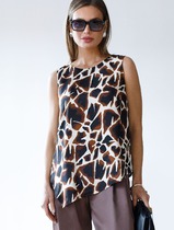 Костюм женский состоящий из юбка-шорт и блузы, блуза асимметричного кроя выполнена из сочетания тканей компаньонов льна-Вишера. Изделие с втачным рукавом и одним открытым плечом, горловина изделия округлая. Юбка-шорты на притачном поясе с резинкой, застежка молния на гульфике и кнопки. На отлетной детали шорт расположен накладной карман. изделие декорировано термопечатью.