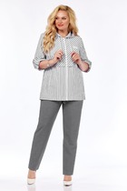 Костюм женский состоит из рубашки и шорт, выполнен из костюмной ткани. Рубашка свободного кроя, по полочке изделия расположены накладные карманы. Рукав изделия длинный. Горловина отложной воротник на стойке. По спинке изделия расположена кокетка и декоративный вырез с бантом. Застежка петли-пуговицы на планке. Шорты прямого кроя с небольшим подворотом по низу. Изделие на притачном поясе с резинкой.В боковых швах расположены карманы. Застежка молния на гульфике и петля-пуговица.