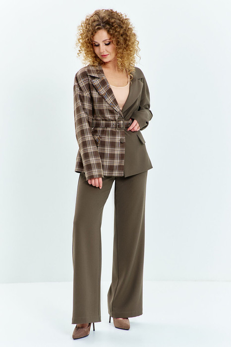 Костюм женский двухпредметный, состоит из жакета и брюк. Жакет свободного кроя со спущенным рукавом и английским отложным воротником с лацканами. По полочкам изделия расположены прорезные карманы с клапаном. Рукав и полочка изделия выполнены из ткани-компаньона. Брюки классического кроя, завышенной посадки на притачном поясе с эластичной лентой, в боковых швах брюк расположены функциональные карманы