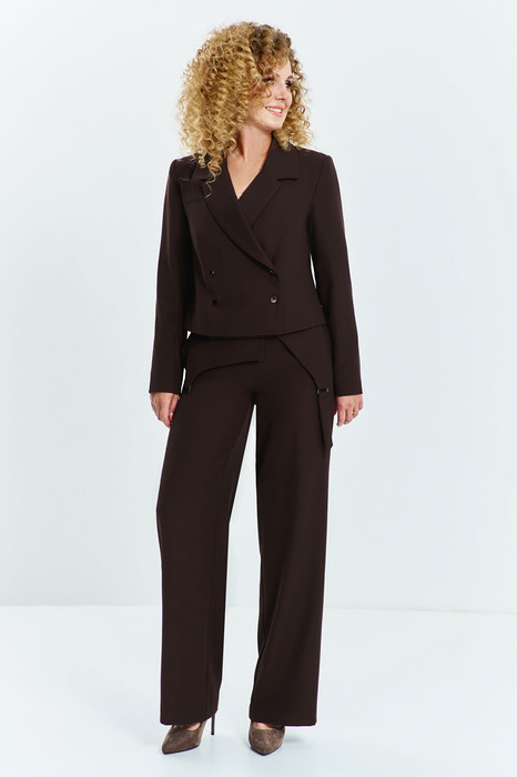 Костюм женский, состоит из жакета, брюк и баски. Жакет прямого кроя, укороченный двубортный, воротник отложной с лацканам. Спинка разрезная с декоративными элементами. Жакет на подкладке, застежка-кнопки. Брюки классические средней посадки, прямого кроя на притачном поясе с резинкой, в боковых швах имеются карманы, застежка кнопки и молния на гульфике. Баска съемная декоративная, застегивается на кнопки, регулируется пряжкой на спинке