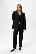 Костюм женский двойка из джинса, состоит из джинсовой рубашки и брюк( джинсы). Рубашка свободного кроя, на полочке расположена кокетка и накладные карманы с клапанами декорированные бахромой, воротник отложной на стойке, рукав втачной длинный низ рукава с манжетой, спинка с отрезной кокеткой. застежка- петля-пуговица на планках по переду. Брюки - клеш слегка расширенные к низу на притачном поясе, в боковых швах расположены карманы, на задних полотнищах брюк накладные фигурные карманы и кокетка. Застёжка молния на гульфике и петля-пуговица.