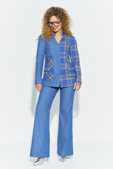 Костюм женский 2х-предметный, состоит из жакета и брюк. Жакет полуприлегающего силуэта выполнен из сочетания тканей Джинса и костюмной ткани, по полочке жакета расположена накладная деталь с функциональным прорезным карманом "рамка", и декоративные фальш-карманы в области груди. Рукав втачной длинный. Горловина обработана плоско лежащим воротником-стойкой. Застежка жакета - потайная (супатная) на петли-пуговицы. Жакет на полной подкладке. Брюки классического кроя, с небольшим клешем к низу, с высокой посадкой, выполнены из джинсовой ткани. Пояс в брюках втачной в боковых швах имеются карманы, застежка молния на гульфике и петля-пуговица. На задних полотнищах брюк расположена накладные карманы.