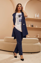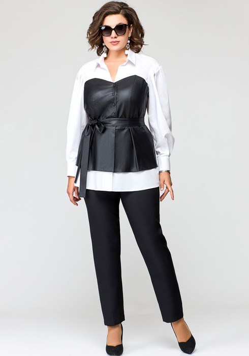 Костюм женский нарядно-повседневный состоящий из блузы и юбки. Блуза прилегающего силуэта выполнена из ткани 2х дизайнов: хлопка и экокожи на хлопковой основе. Вырез горловины V-образный с воротничком, рукав втачной со складками по пройме и притачной манжетой по низу рукава. Застежка на кнопки. По полочке и спинке фигурная притачная деталь из экокожи в виде имитации карсета, по талии отрезная двойная баска (лицо - экокожа, изнанка - хлопок). Декором служит сьемный пояс из экокожи. Брюки классические на притачном поясе зауженные к низу. Пояс частично на резинке, застежка гульфик на молнии. В боковых швах обработаны карманы. Выполнены из костюмной ткани.