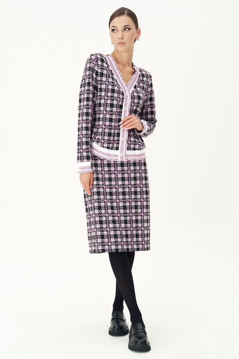 Модный трикотаж стал бесспорным "must have" в этом осеннем сезоне. Носить любимые и практичные трикотажные вещи теперь можно смело, не беспокоясь о модных тенденциях, а только соответствуя им. Практичность такого гардероба сложно переоценить, вещи из одного лука можно смело сочетать с другими вещами и при этом выглядеть супер современно. Комплект состоит из джемпера и юбки. Джемпер свободного силуэта с втачным рукавом. Застежка центральная на петли и пуговицы. По линии борта, низу изделия, рукавам и горловине - отделочная эластичная тесьма "довяз" с легким блеском. Юбка зауженная к низу, на притачном поясе с частично эластичными вставками в области боковых швов. Длина джемпера около 52 см. Длина рукава около 60 см. Длина юбки около 55 см.