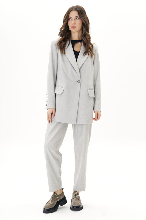 Свободный упрямлённый пиджак, оверсайз силуэта, втачного покроя со смещённой застёжкой на петлю и пуговицу, пиджачным классическим воротником.