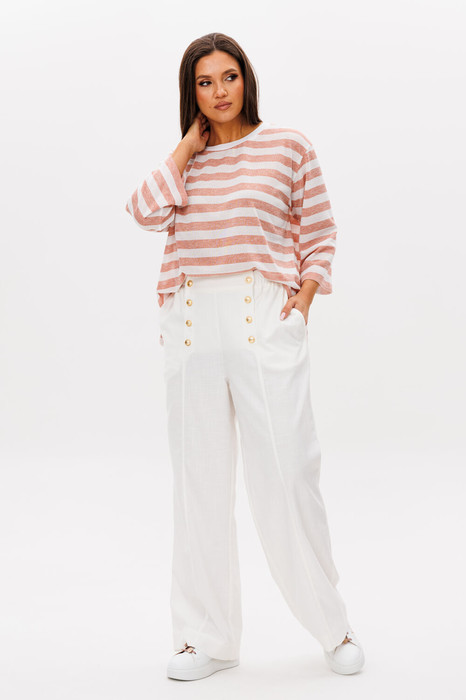 "Костюм брючный 2-х предметный. Воплотить уникальный образ на основе базовых вещей оказывается не так уж и сложно. Идеальное сочетание и пропорции-трикотажный джемпер в полоску и белые брюки с акцентной металлической фурнитурой.