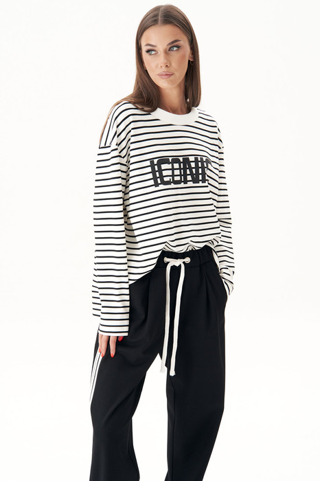 Свитшот свободный, с заниженной линией плеча, рубашечным рукавом, зауженным к низу, разноуровневым низом и авторским принтом. По горловине тельма-довяз.