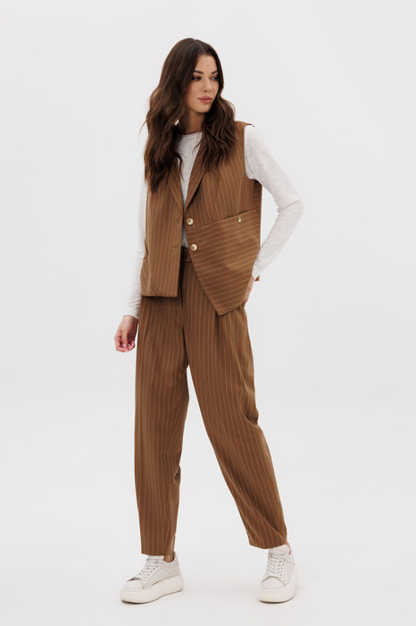 Костюм с жилетом - прекрасное решение для смелых экспериментов. Выполненный в актуальной цветовой гамме, он позволяет дополнять себя различными аксессуарами и создавать каждый раз новые актуальные образы. Жилет прямого силуэта с центральной застёжкой и фигурным разноуровневым бортом. Спинка с декоративной разноуровневой планкой, которая имитирует застежку. Брюки классического покроя с высокой посадкой на притачном поясе со шлёвками, зауженные. Застежка брючная на потайной крючок и молнию. Передние половинки брюк с мягкими складками-защипами и наклонными боковыми карманами. Задние половинки брюк с вытачками и прорезными карманами с листочками.