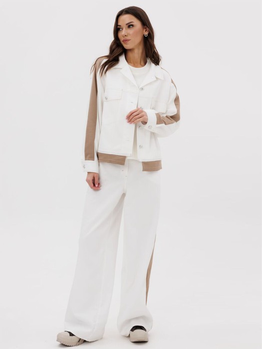 Свободный силуэт, рубашечный покрой, втачной воротник, рукав с притачной манжетой. Полочка с отрезной кокеткой, рельефами и карманом с клапаном. Спинка с отрезной кокеткой и рельефами. Рукав с локтевым швом и разрезом в нём, отделочным лампасом по центру рукава из контрастного денима, мягкой складкой и притачной манжетой. По низу куртки - притачная отделочная полоса в цвет лампаса. Застёжка центральная на петли и пуговицы.