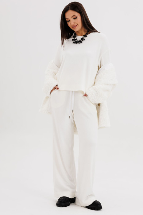 Такой вариант неформального костюма можно отметить отдельно-это настоящий шик, который в любой обстановке смотрится по-особенному. Невероятное ощущение расслабленности и комфорта обеспечивает удобный покрой и тактильно уютный трикотаж с эффектом вельвета. Брюки свободного кроя, прямые, с наклонными боковыми карманами , на эластичном поясе с люверсами и отделочным шнуром. Джемпер рубашечного покроя, свободный, слегка укороченный. Горловина круглая с притачной обтачкой. Рукав рубашечный расширенный к низу.