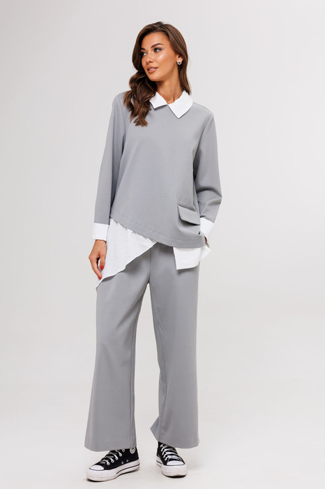 Верх: асимметричный джемпер с контрастным белым воротником и вставками, создающий эффект многослойности. Декоративный карман добавляет акцента.