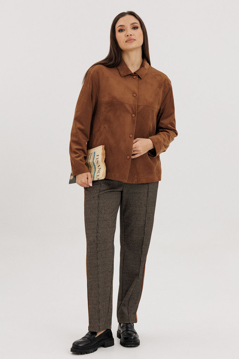 Стильный женский брючный костюм в стиле смарт-кэжуал сочетает комфорт и элегантность. Рубашка выполнена из замшевой ткани, брюки из трикотажа с декоративными замшевыми вставками. Идеальный выбор для офиса, деловых встреч и повседневных образов.