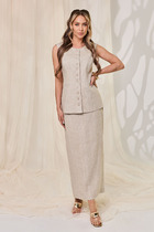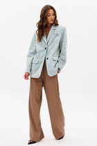 Принт — тонкий геометрический узор в тон ткани, который придаёт образу глубину и динамику.