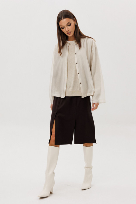 К ней идеально подходит трикотажный джемпер из мягкого смешанного полотна с шерстью — комфортный, тёплый и благородно текстурный. Он создаёт аккуратный, дорогой объём и мягко обнимает фигуру, обеспечивая комфорт в течение всего дня.