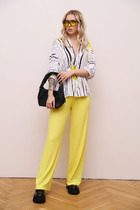 Брюки свободные, прямые на притачном эластичном поясе с контрастными лампасами и карманами с листочками в боковых швах.