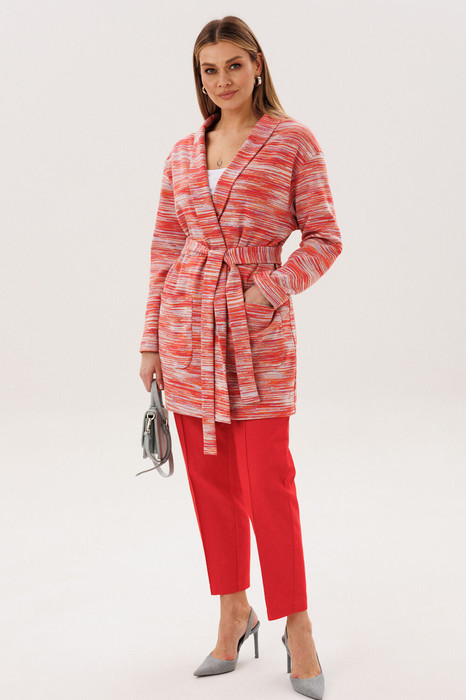 Стильный комплект, в котором выразительная фактура трикотажа сочетается с практичностью денима. Кардиган выполнен из мягкого трикотажного полотна с декоративным узором, который добавляет образу динамику и подчёркивает его fashion-характер. Прямой силуэт и аккуратная линия плеч делают модель универсальной и легко адаптируемой под разные стилистические сценарии.