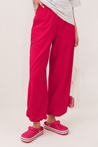 Брюки свободные, прямого силуэта. Пояс цельнокроеный на резинке, в боковых швах - карманы. Низ брюк обработан швом в подгибку с открытым срезом.
